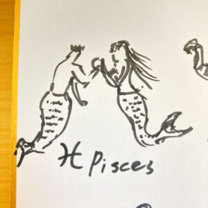 古代ギリシャ神話のなかで、うお座を象徴する2人の魚人が、怪物から逃れるために川へ飛び込んだ二人がはぐれないように手をつないでいるイメージ。