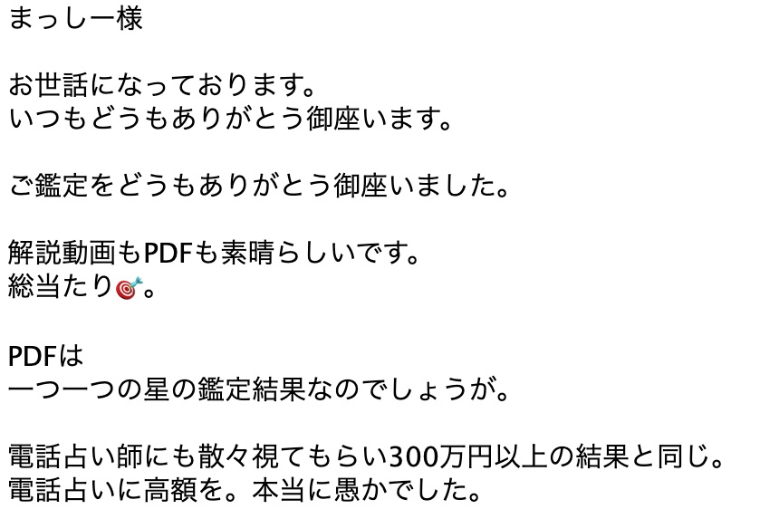 ☆鑑定は鑑定動画(30分ほど)をPDF形式で添付してお送りします。鑑定結果の質問にもお答えします