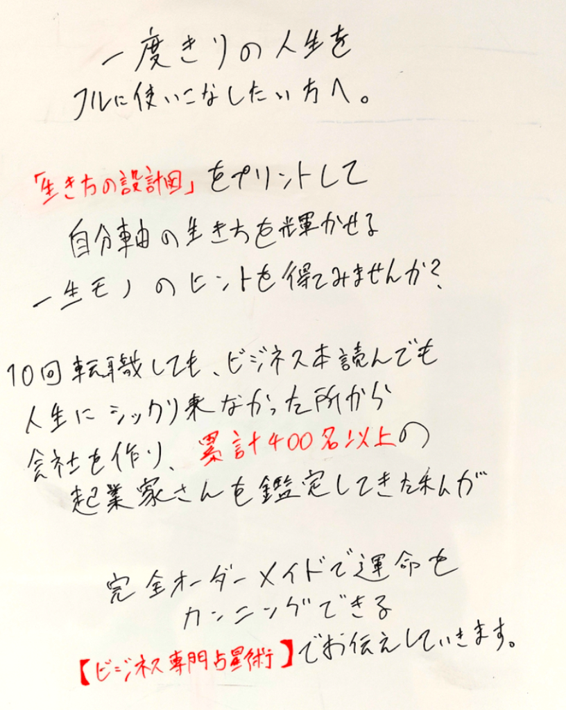「累計700名の鑑定経験がある」「実際に株式会社を興して8年目の視点から語れる」「職歴が多い(自衛官、サラリーマン、飲食店、製造業、起業)」「ビジネスモデルやブランディングなど、実務的な部分まで具体的なアドバイスができる」といった点は、他の占い師さんを見てもあまり見当たらないようです。